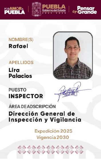 • Nombre completo de la Persona Servidora pública autorizada para realizar inspecciones, verificaciones o visitas domiciliarias: Rafael Lira Palacios