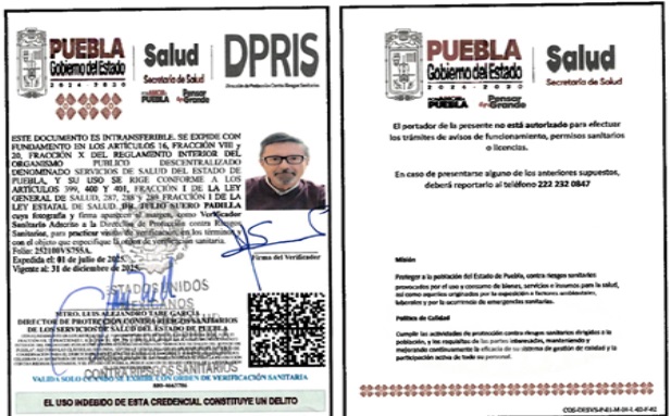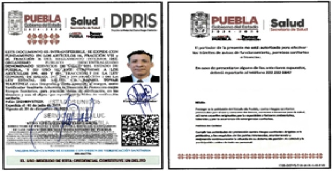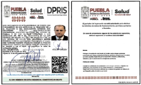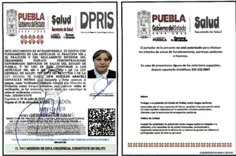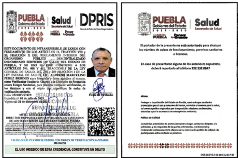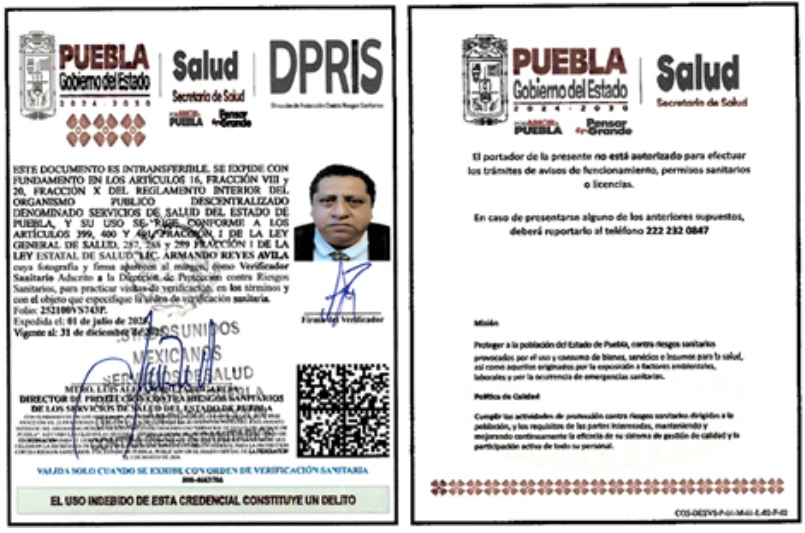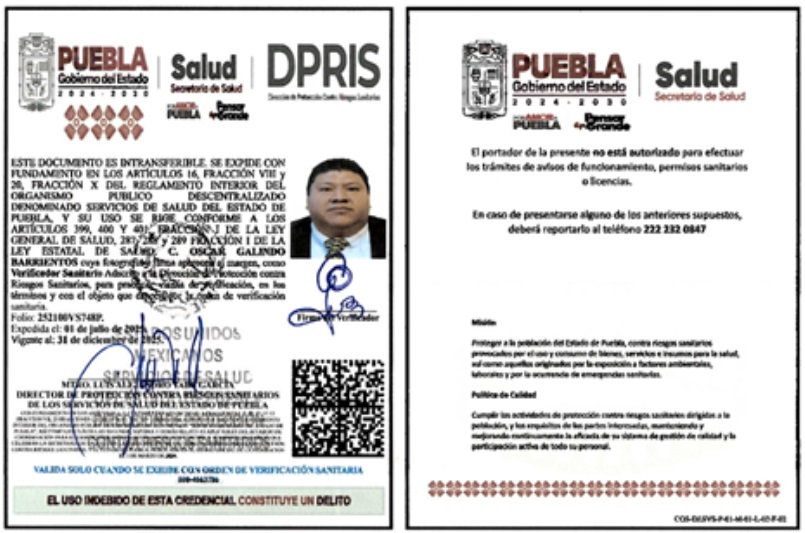 • Fundamento Jurídico de la inspección: Artículos: 4° párrafo cuarto, 14 y 16 de la Constitución de los Estados Unidos Mexicanos; 3° fracción I, 4° fracciones III y IV, 13 apartados A, fracción II, y B fracciones VI y VII; 393, 396, fracción I, 397, 398, 399, 400, 401, 402, 403, 404, 425, 431 y 436 de la Ley General de Salud; cláusulas Segunda, primero y segundo párrafos, y el Anexo 1, criterio 3, del Acuerdo Específico de Coordinación para el ejercicio de facultades en materia de control y fomento sanitario, que celebran la Secretaría de Salud, con la participación de la Comisión Federal para la Protección contra Riesgos Sanitarios, y el Estado de Puebla, Publicado en el Diario Oficial de la Federación el 2 de enero de 2007; y los artículos 3 fracción II, de la Ley Estatal de Salud, artículos 4 fracción III, inciso B), subinciso B.3, 16 fracción VIII y 20 fracciones II, IV y XV del Reglamento Interior del Organismo Público Descentralizado denominado Servicios de Salud del Estado de Puebla.