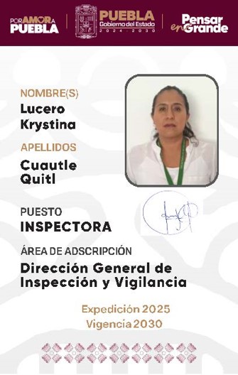 • Nombre completo de la Persona Servidora pública autorizada para realizar inspecciones, verificaciones o visitas domiciliarias: Lucero Krystina Cuautle Quitl