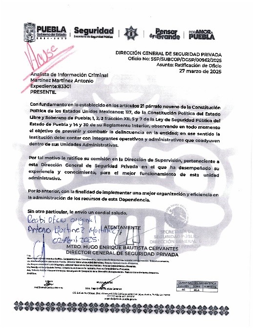 • Nombre completo de la Persona Servidora pública autorizada para realizar inspecciones, verificaciones o visitas domiciliarias: Antonio Martínez Martínez