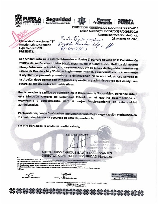 • Fundamento Jurídico de la inspección: Artículos 31, 32, 33, 34, 35, 36, 37 y 38 de la Ley de Seguridad Privada del Estado Libre y Soberano de Puebla. Artículos 51, 52, 53, 54, 55, 56, 57, 58, 59, 60, 61, 62, 63, 64, 68, 69, 70, 71 y 72 del Reglamento de la Ley de Seguridad Privada del Estado de Puebla.