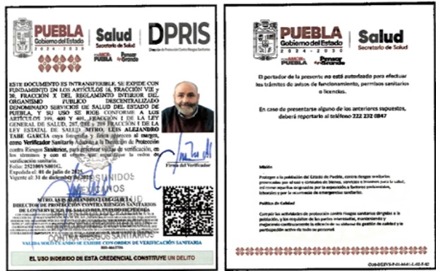 • Fundamento Jurídico de la inspección: Con fundamento en lo dispuesto en los artículos 4°, párrafo cuarto, 14 y 16 de la Constitución Política de los Estados Unidos Mexicanos; 3° fracciones XXII y XXIV, 4°, fracciones IlI y IV, 13, apartado A, fracción II, y B, fracciones VI Y VII, 194, fracción I, 197, 199, 393, 396, fracción I, 397, 398, 399, 400, 401, 401 Bis, 401 Bis-1, 401 Bis-2, 402, 403, 404, fracción VIl y X 425, 431 y 436 de la Ley General de Salud; cláusulas Segunda, primero, segundo y último párrafo, Séptima, primero y segundo párrafos, y el Anexo 1, criterio 3, del Acuerdo de Coordinación para el ejercicio de facultades en materia de control y fomento sanitarios, que celebran la Secretaría de Salud, con la participación de la Comisión Federal para la Protección contra Riesgos Sanitarios, y el Estado de Puebla, publicado en el Diario Oficial de la Federación el 1 de marzo de 2024;y los artículos 3, Fracción II, de la Ley Estatal de Salud, artículos 1, 2, 5 último párrafo inciso e), 6 fracciones I, II, III, IV, VI 13 fracción VII, 23 fracciones I, II, III, IV V. VI. XIII, XIV y demás relativos aplicables del Reglamento Interior del Organismo Público Descentralizado denominado Servicios de Salud del Estado de Puebla, y cuarto transitorio del Decreto del Ejecutivo del Estado por el que se expidió éste, publicado en el Periódico Oficial del Estado el 8 de febrero de 2013.